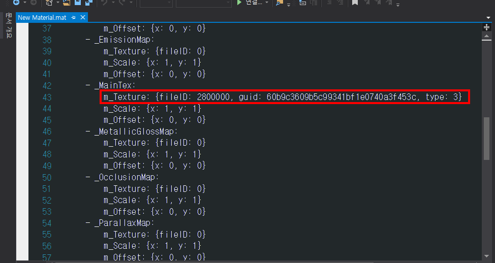 6)재질 파일(.mat)을 텍스트 편집기에서 확인한다. 재질의 메인 텍스처에서 해당 에셋의 고유 ID를 참조하고있는것을 확인할수있다.