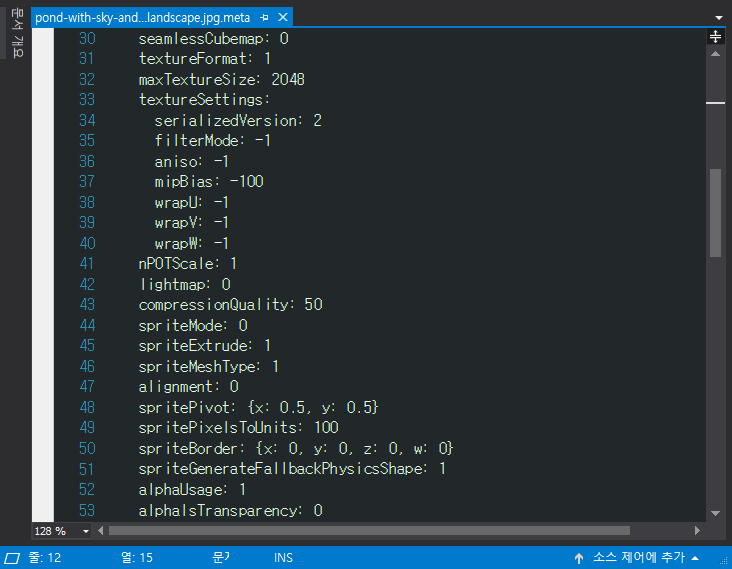 2)텍스트 편집기에서 메타파일의 정보를 확인할수있다. 예에서 텍스처의 메타파일을 비쥬얼스튜디오에 드래그, 드롭하였다.