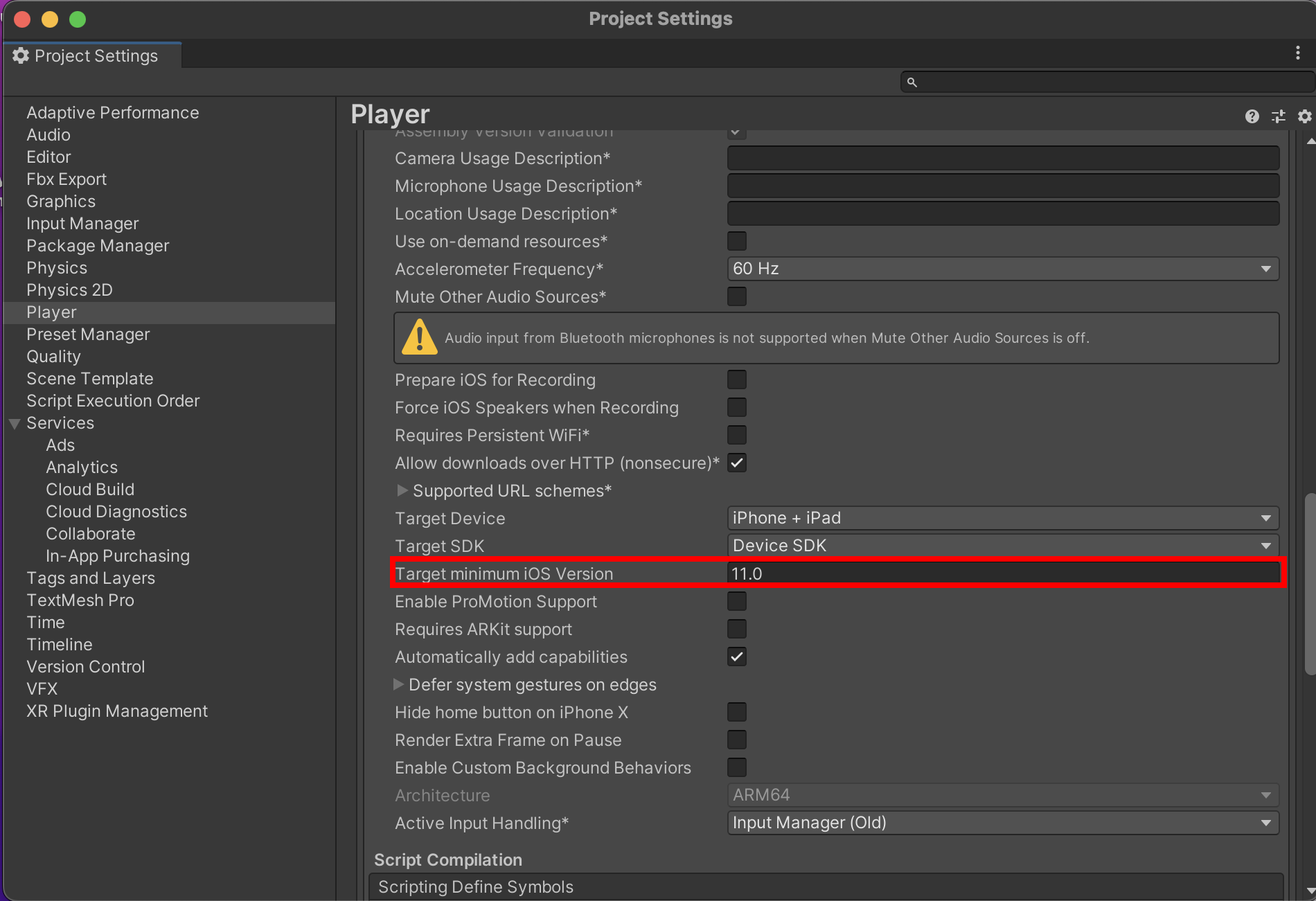 5)Target minimum iOS Version에서 최소 iOS 버전을 설정합니다.