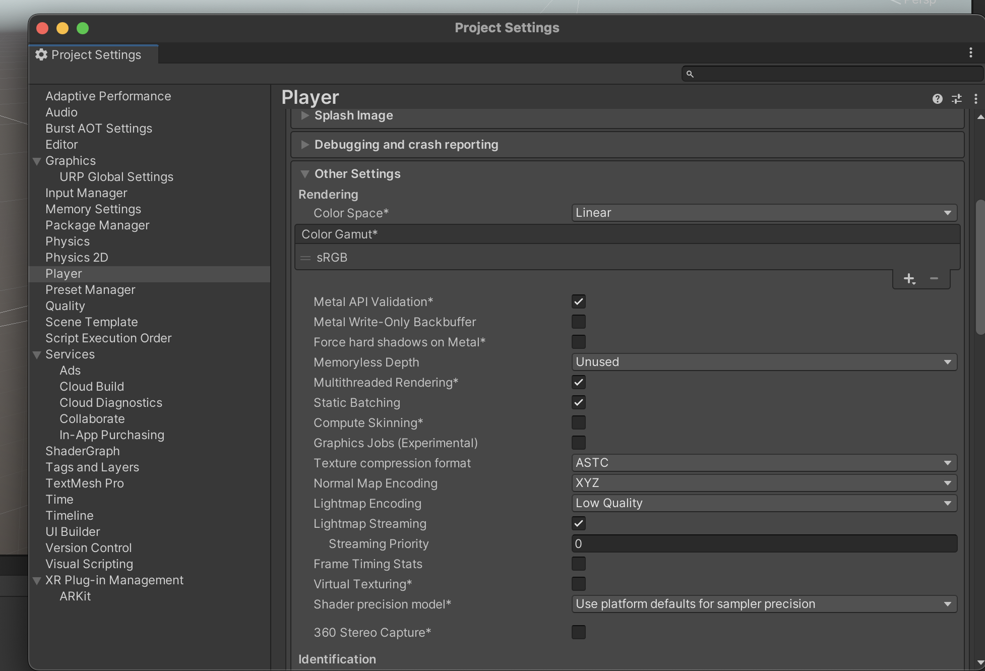 3)프로젝트 설정(project settings)의 Player에서 company name, product name, version을 확인합니다.