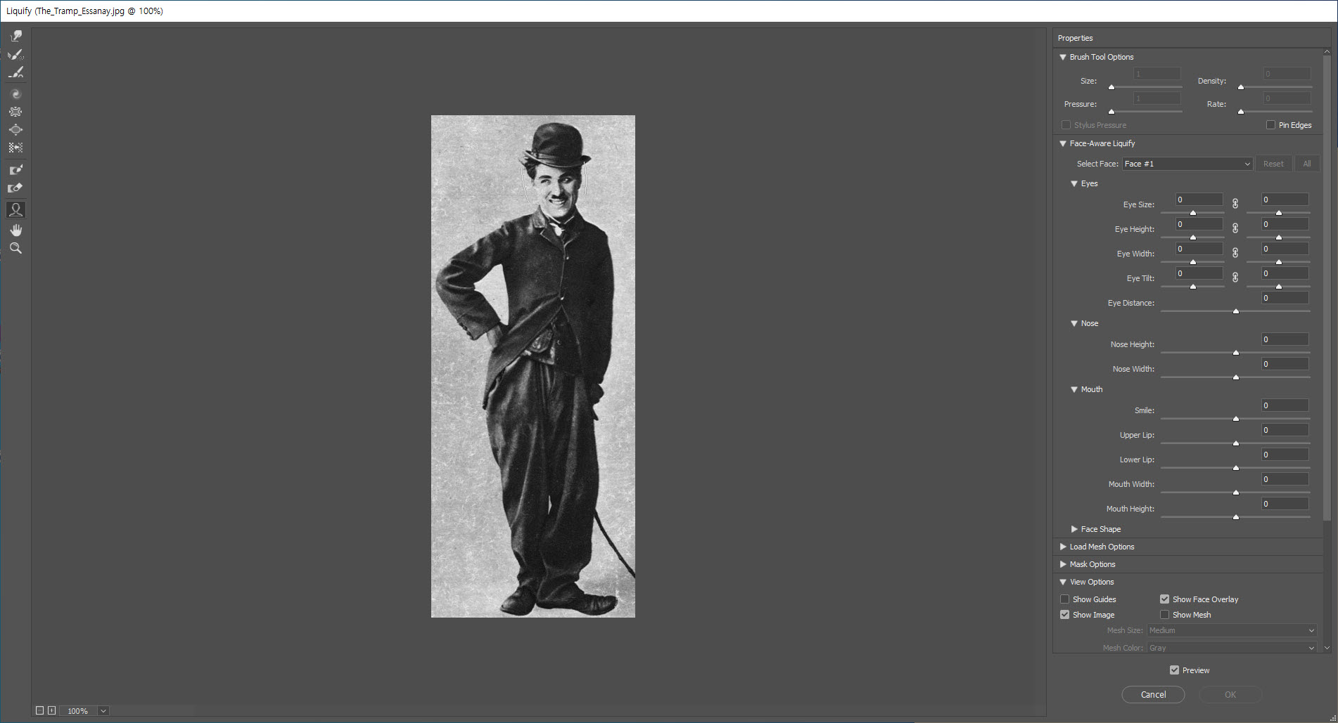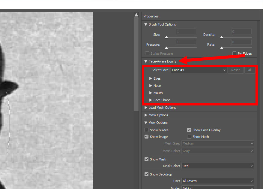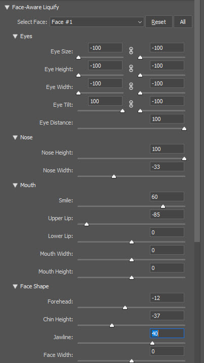 7)face-aware liquify에서 인식된 얼굴을 선택하고 얼굴(eyes, nose, mouth, face shape)의 속성을 변경합니다.