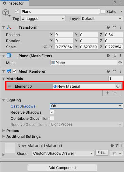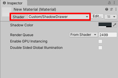 2)새로운 재질을 생성하고 plane에 할당합니다. 재질의 쉐이더를 설정합니다(ShadowDrawer)