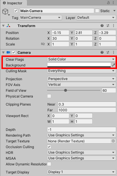 4)게임뷰에서 그림자를 정상적으로 표시하려면 카메라의 스카이박스를 비활성화해야합니다. 카메라의 clear flags를 solid color로 변경합니다.