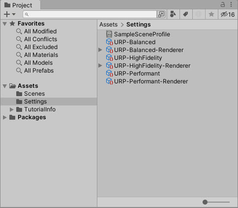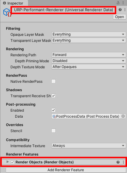 2)프로젝트의 Settings 폴더에서 렌더 파이프라인 에셋과 렌더러 데이터를 확인할수있습니다. 현재 렌더파이프라인에서 사용중인 렌더러를 선택합니다(URPP-HighFidelity-Renderer)