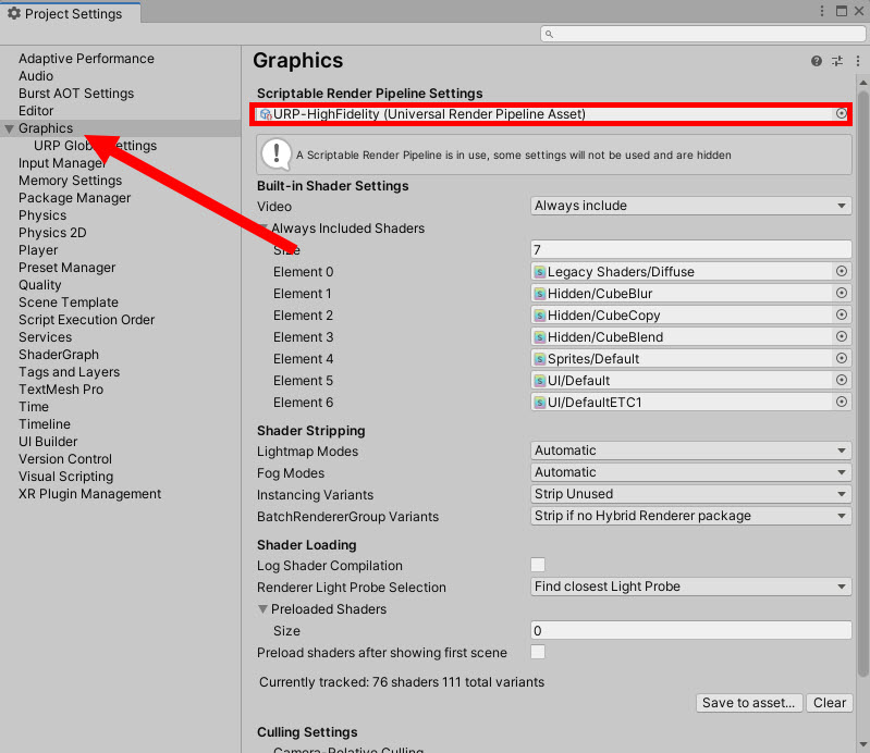 1)프로젝트 설정(project settings)의 graphics에서 현재 프로젝트의 렌더 파이프라인이 URP로 설정되어있는것을 확인할수있습니다.