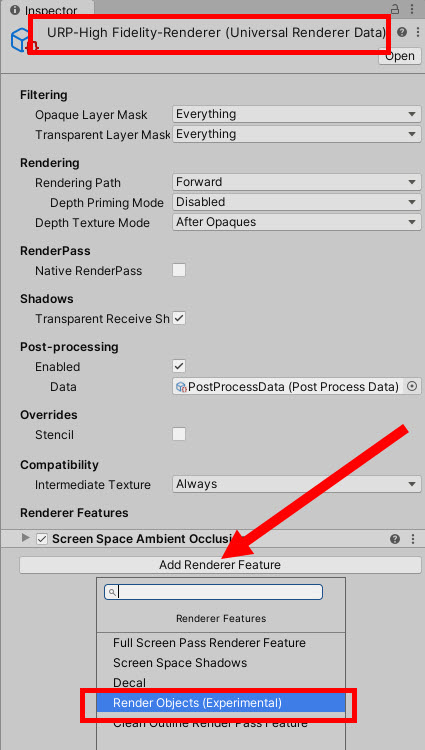 2)프로젝트의 Settings 폴더에서 렌더 파이프라인 에셋과 렌더러 데이터를 확인할수있습니다. 현재 렌더파이프라인에서 사용중인 렌더러를 선택합니다(URPP-HighFidelity-Renderer)