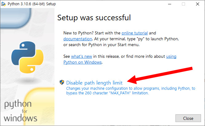 기본적으로 윈도우에서는 파일(디렉터리 포함)의 전체 경로를 260자 이하로 제한합니다. 파이썬 프로젝트에서 이 제한을 초과하는 긴 경로를 사용하려면 disable path length limit을 클릭하여 이 제한을 해제합니다.