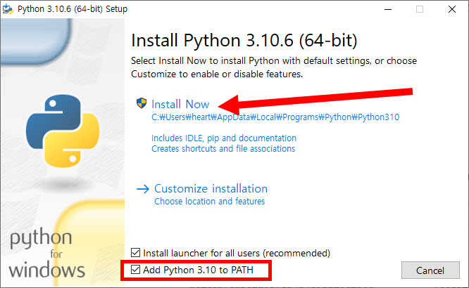 3)다운로드한 설치 프로그램을 실행하고 install now를 클릭하여 파이썬 설치를 진행합니다. 시스템의 PATH 환경 변수에 파이썬(Python)을 추가하고 명령 프롬프트에서 파이썬 명령을 직접 실행하려면 add phyton 옵션에 체크합니다.