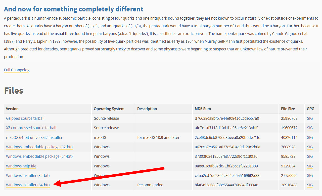 2)메인페이지 하단의 files에서 적합한 버전의 파이썬 설치 프로그램을 다운로드합니다. 예에서 윈도우10에서 사용하기 위한 windows installer(64-bit) 버전을 다운로드합니다.