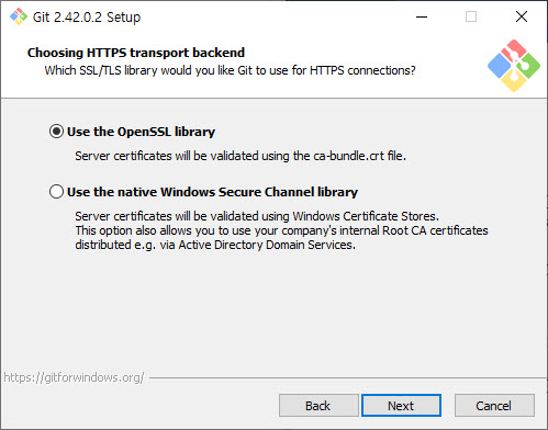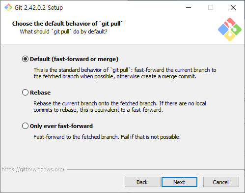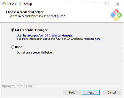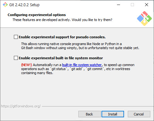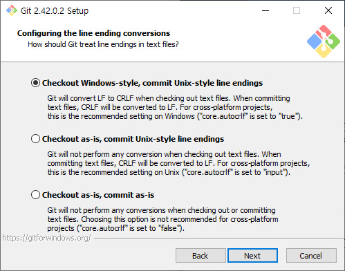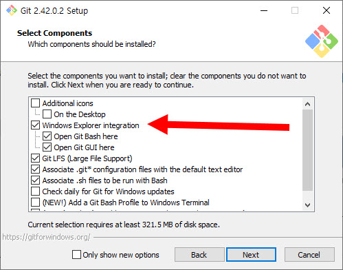 windows explorer intergration에 체크하면 윈도우 탐색기에서 마우스 우클릭하면 Git 명령에 대한 바로 가기 메뉴를 표시합니다.