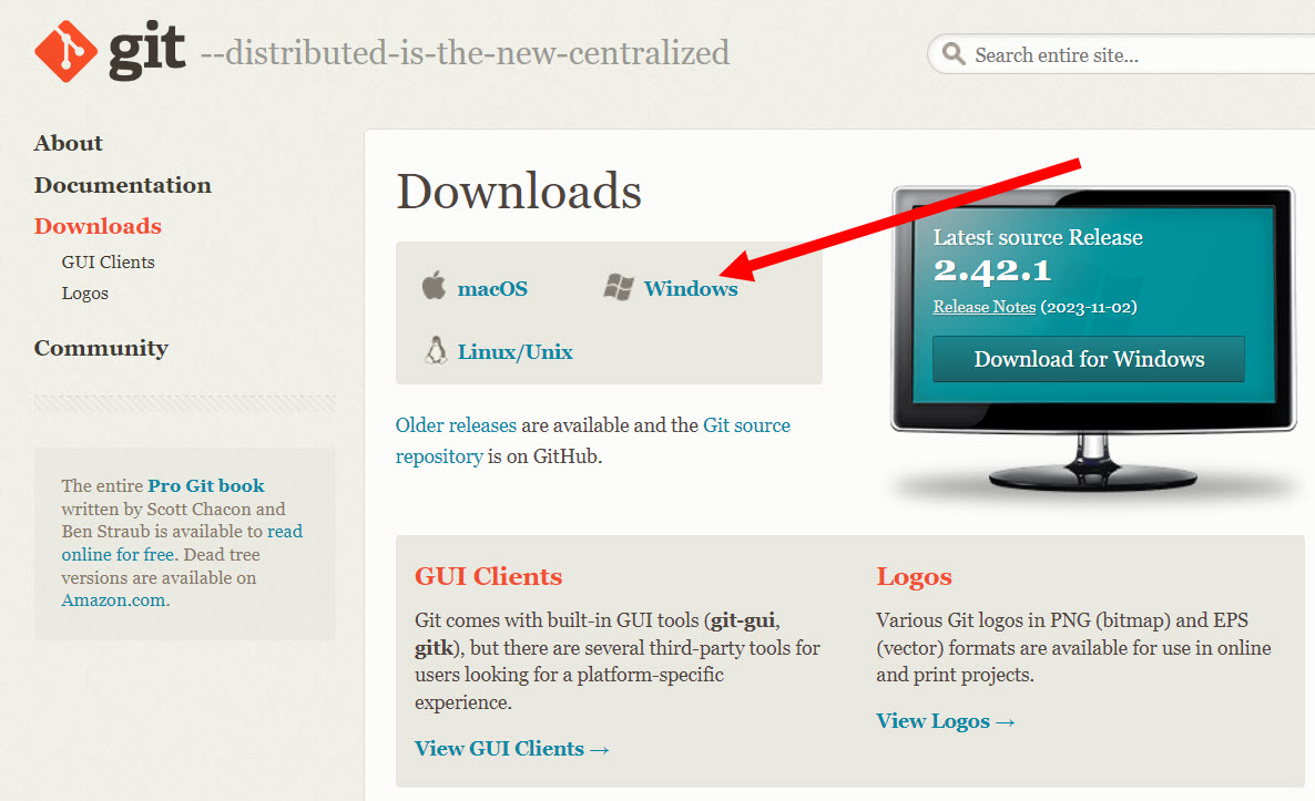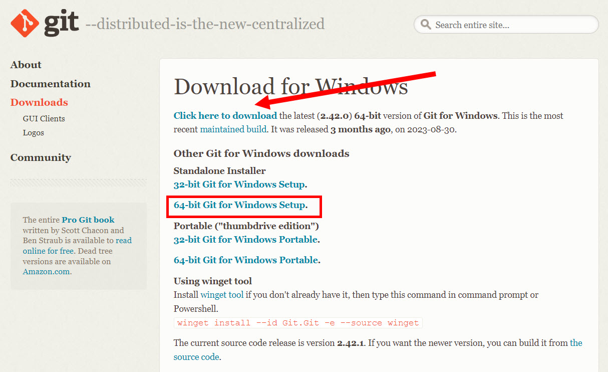 1)아래 깃(Git) 공식 웹사이트에서 적합한 버전의 설치 프로그램을 다운로드합니다.