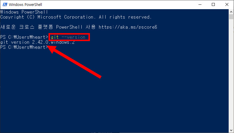 10)윈도우 파워쉘을 실행하고 git --version을 입력하면 설치된 깃 버전을 확인할수있습니다.