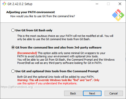 5)Git 명령을 명령 프롬프트 또는 기타 소프트웨어에서 사용할 수 있도록 PATH 환경 변수에 Git를 추가하려면 git from the command line and also from 3rd-party software 옵션에 체크합니다(기본 설정)