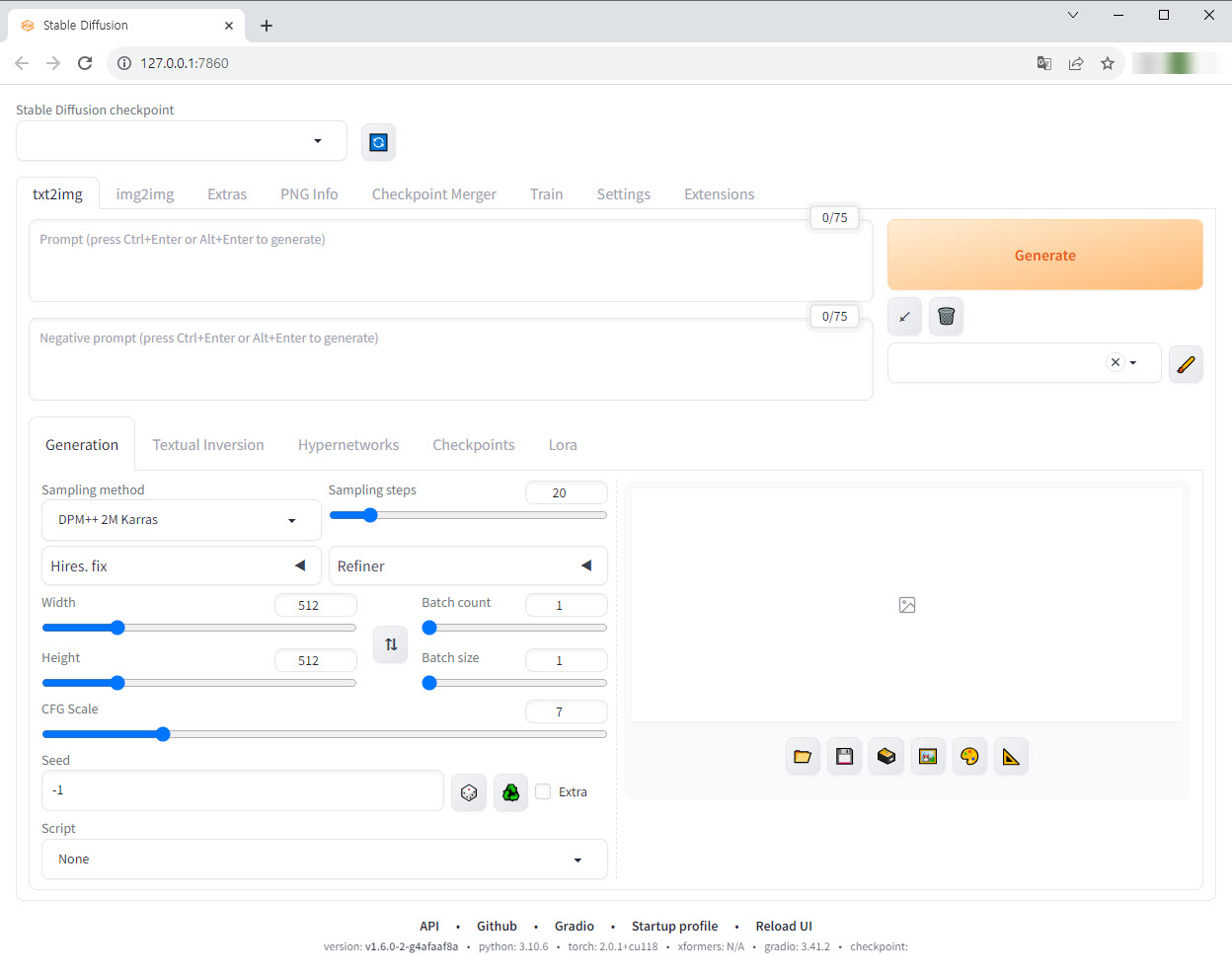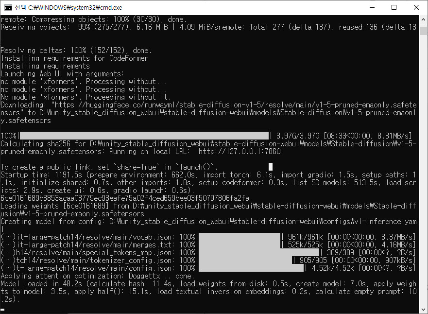 7)설치가 완료되면 웹 브라우저에서 아래 주소를 입력하여 Stable Diffusion webUI가 정상적으로 동작하는것을 확인할수있습니다.