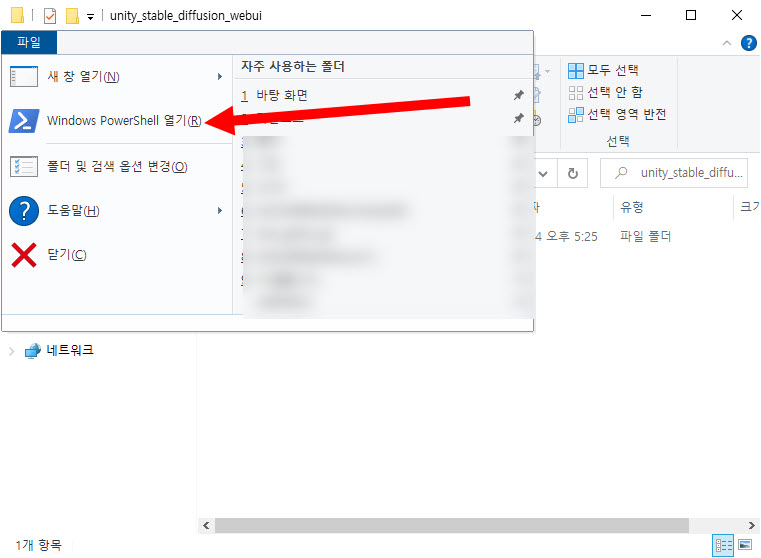 2)해당 폴더에서 Git Bash 또는 윈도우 파워쉘을 실행합니다. 파워쉘의 경우 해당 폴더의 좌측 상단 파일 메뉴에서 windows powershell 열기를 클릭하여 파워쉘을 실행합니다.