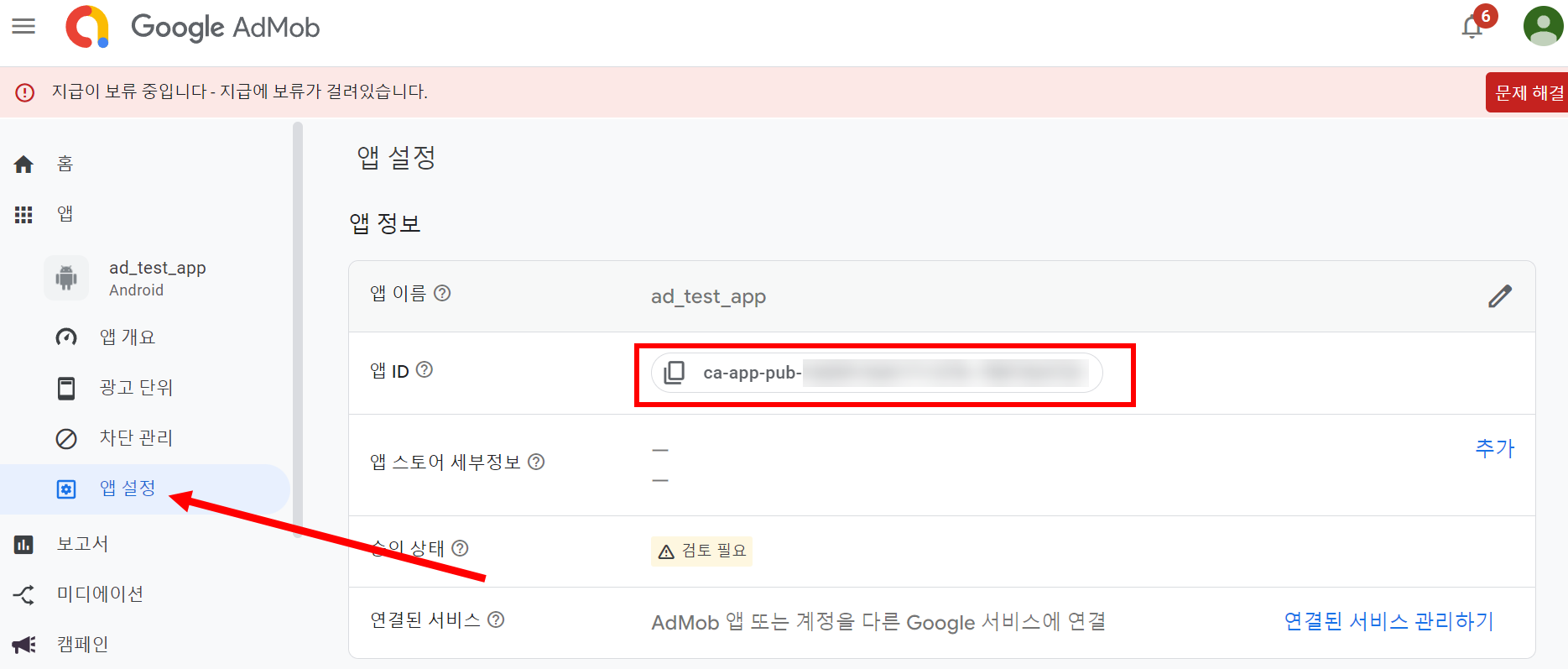 9)안드로이드 또는 iOS의 앱 아이디를 확인하려면 구글 애드몹 웹사이트에서 계정 로그인하고 좌측 앱 메뉴의 앱 설정으로 이동합니다. 앱 정보의 앱 ID에서 앱 아이디를 복사합니다(앱 아이디는 애드몹에 추가한 앱에 대하여 확인할수있습니다)