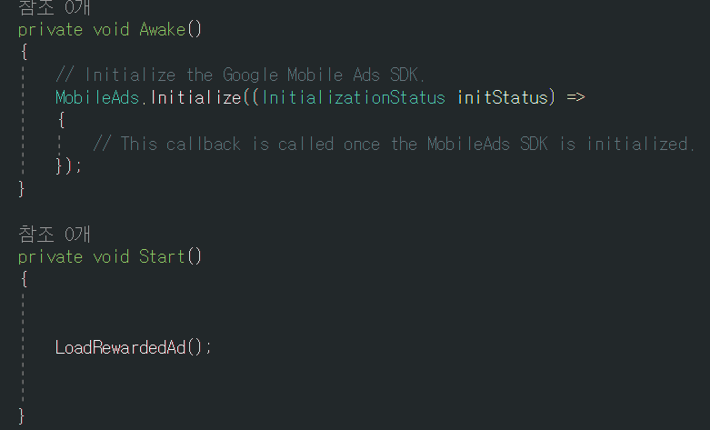예에서 Start함수보다 먼저 호출된 Awake 함수에서 모바일 광고 SDK를 초기화합니다.