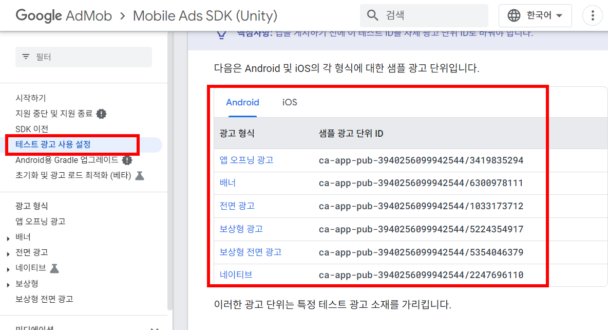 *현재 프로젝트의 광고 설정을 테스트 목적으로 사용하려면 아래 샘플 앱 아이디를 사용합니다.