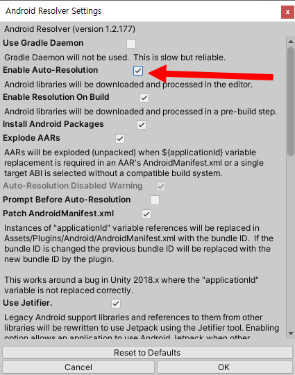 7)enable auto-resolution에 체크되어있는지 확인합니다. 체크 해제되어있으면 체크하고 확인합니다.