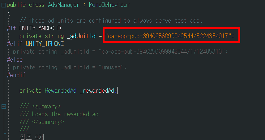 12)새로운 스크립트를 생성하고 아래와 같이 문자열 변수(_adUnitId)에 광고 유닛 아이디를 설정합니다.