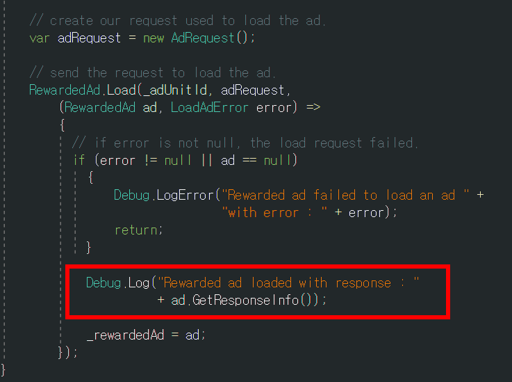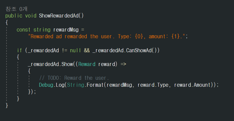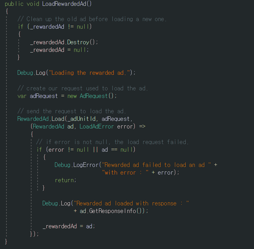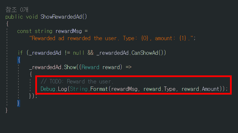 15)광고 로드 함수(LoadRewardedAd)와 광고 표시 함수(ShowRewardedAd)를 구현합니다.