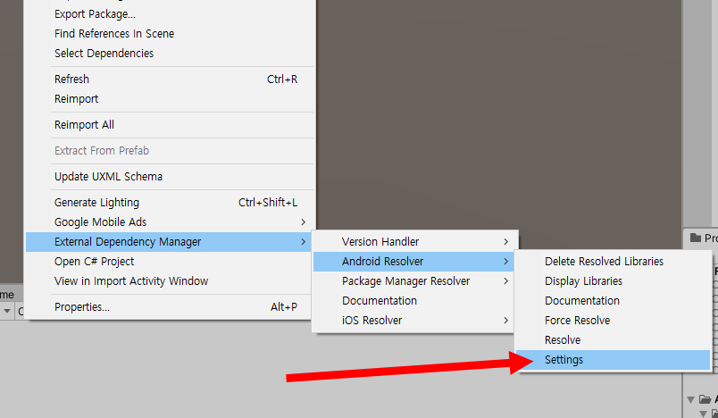 6)상단의 asset 메뉴에서 external dependency manager의 android resolver의 settings로 이동합니다.