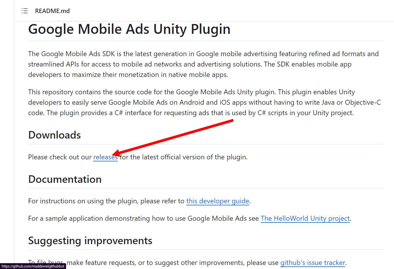 1)아래 구글 모바일 광고 유니티 플러그인 깃허브 웹사이트로 이동하고 다운로드의 릴리즈(releases)를 클릭합니다.