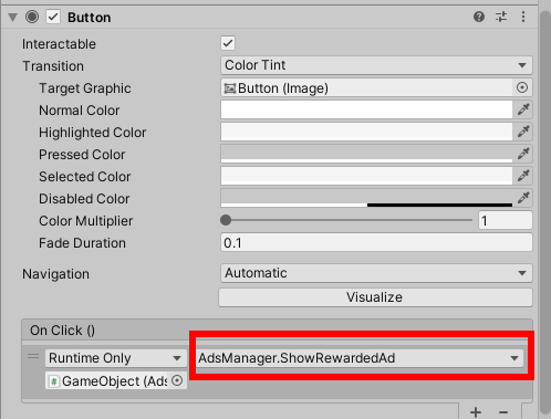17)캔버스에 테스트 목적의 광고 표시 버튼을 추가합니다. 버튼을 클릭하면 광고 표시 함수(ShowRewardedAd)를 호출합니다.