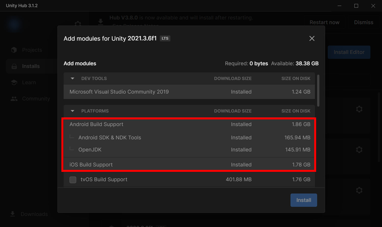 1)유니티 에디터에 안드로이드(또는 iOS) 빌드 지원 모듈이 설치되어있는지 확인합니다.