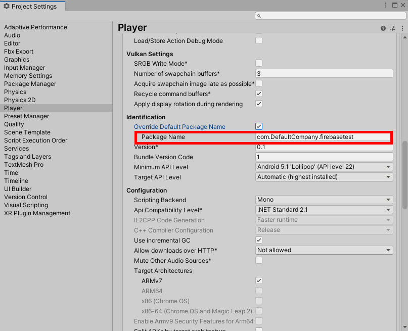 3)프로젝트 설정(project settings)의 player에서 package name을 설정합니다(iOS의 경우 bundle identifier)