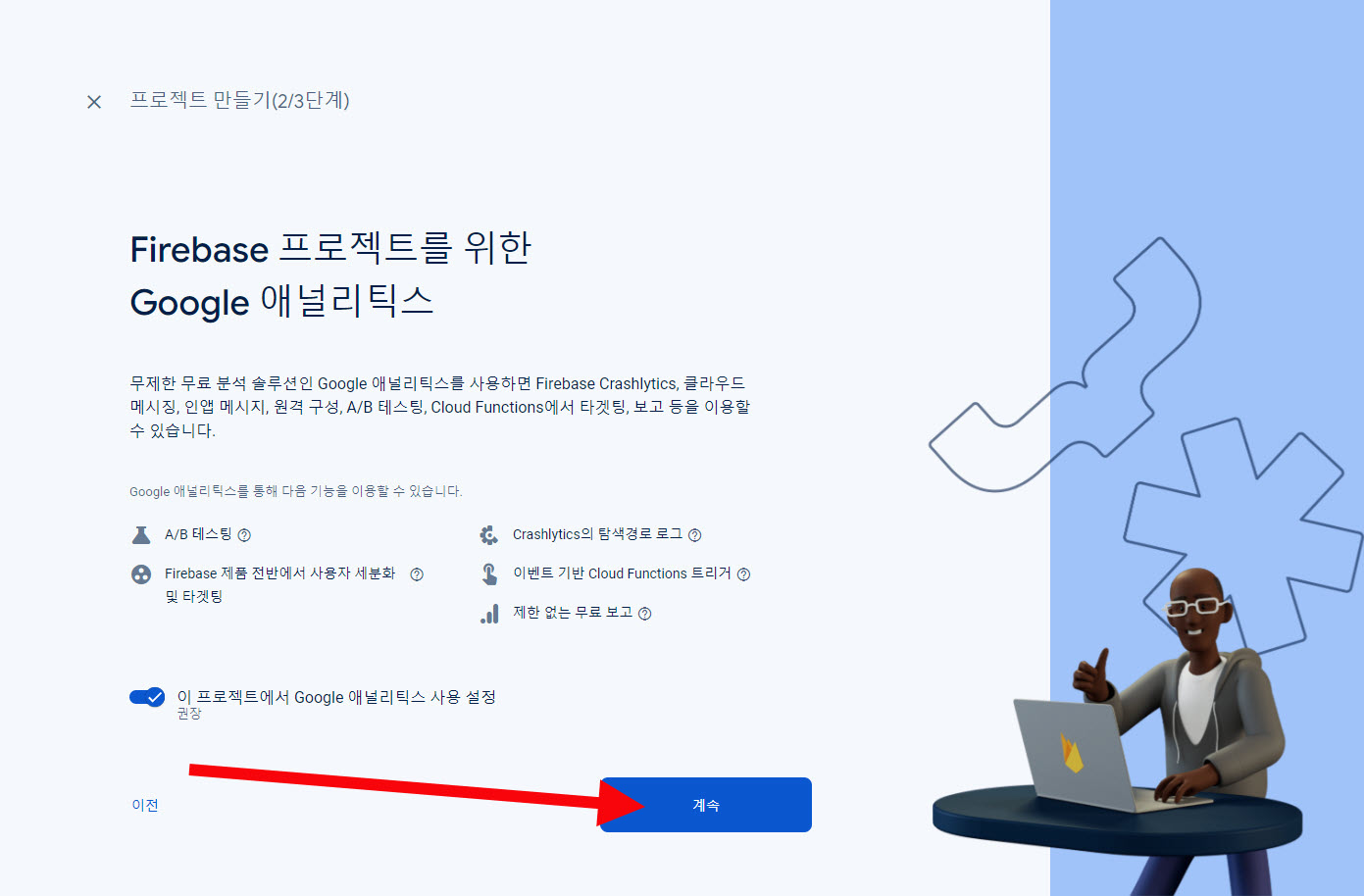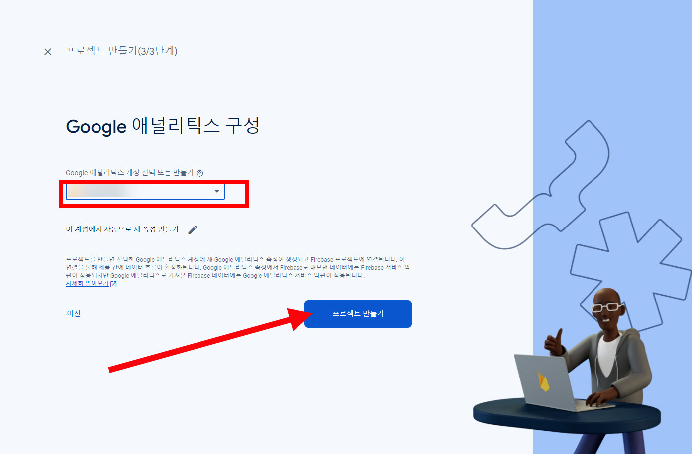 6)프로젝트 만들기 단계를 진행합니다(프로젝트 이름, 구글 애널리틱스 사용설정, 기타)