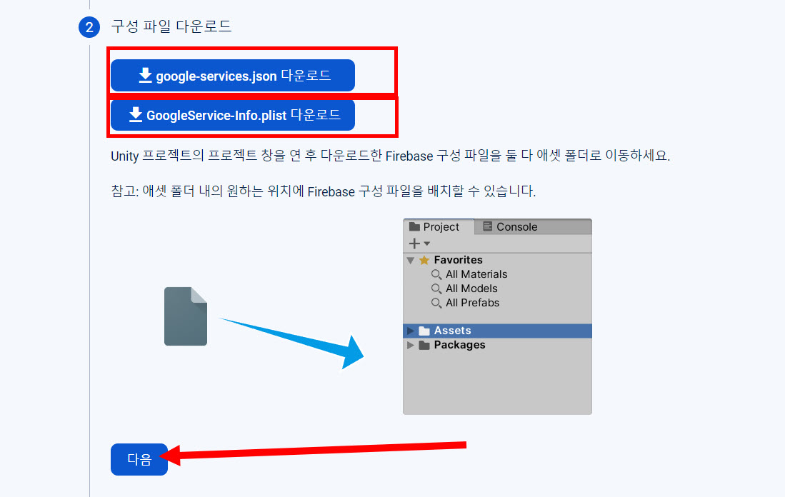 (안드로이드와 iOS 모두 대상으로하는 경우 유니티 프로젝트의 안드로이드와 iOS빌드 대상을 모두 동일한 파이어베이스 프로젝트에 등록해야 합니다)