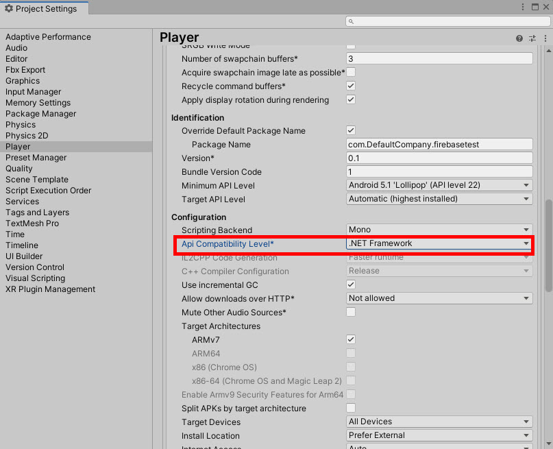 4)api compatibility level에서 . NET 4(.NET Framework)를 설정합니다.
