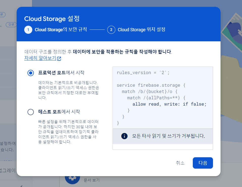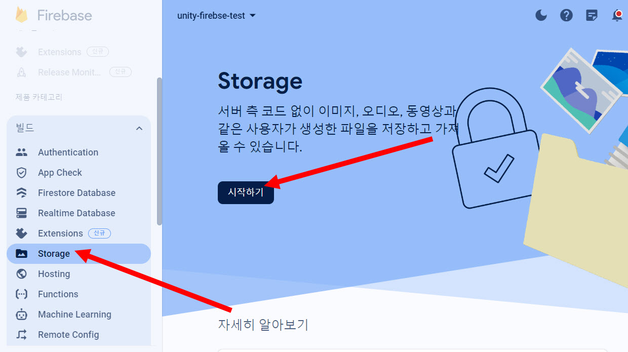 1)파이어베이스 콘솔에서 프로젝트의 저장소(storage) 메뉴를 선택하고 시작하기를 클릭합니다.