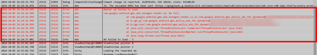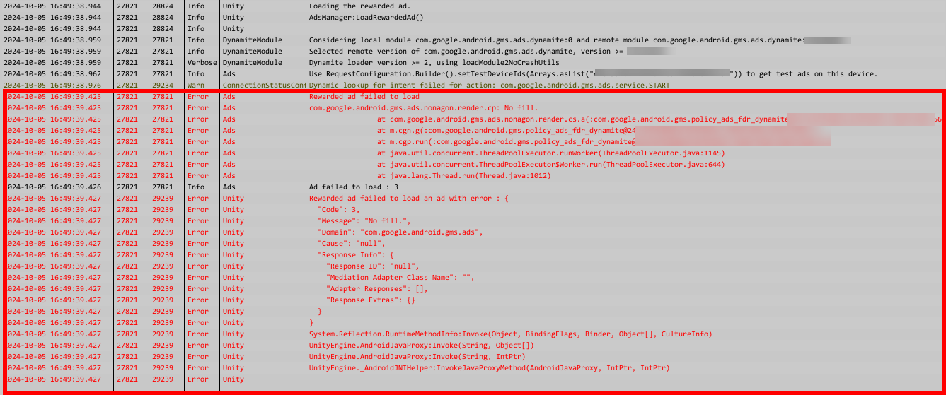 유니티 안드로이드 로그캣(Android Logcat)에서 장치에서 실행중인 앱의 로그를 확인합니다. 구글애드몹 광고(배너, 리워드)를 요청하면 로드 실패(오류 코드 3, ERROR_CODE_NO_FILL)를 출력합니다.