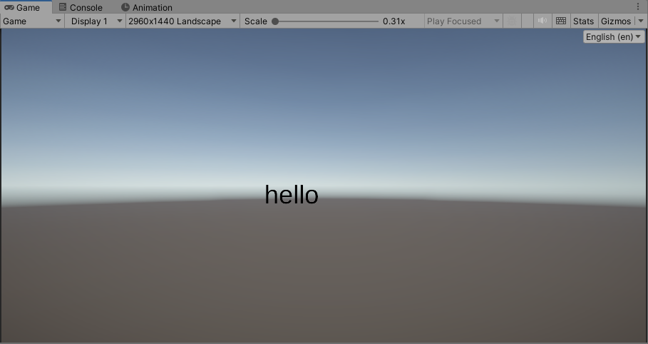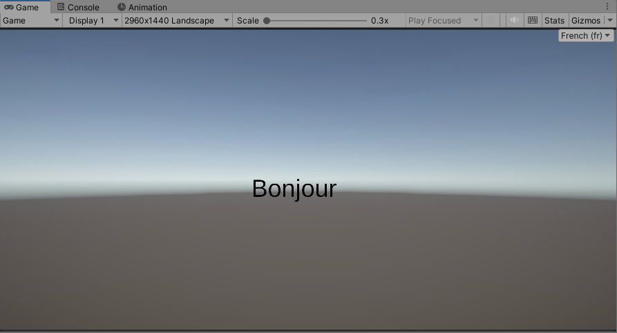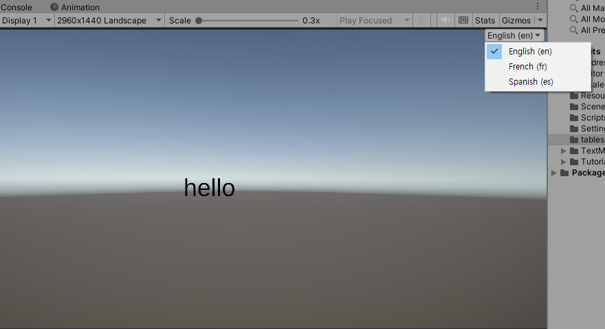 17)Game 패널의 우측 상단에서 지역 및 언어를 변경하면 해당 locale의 텍스트 문자열을 업데이트합니다.