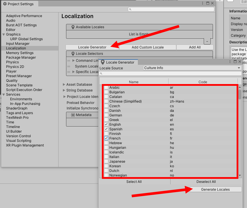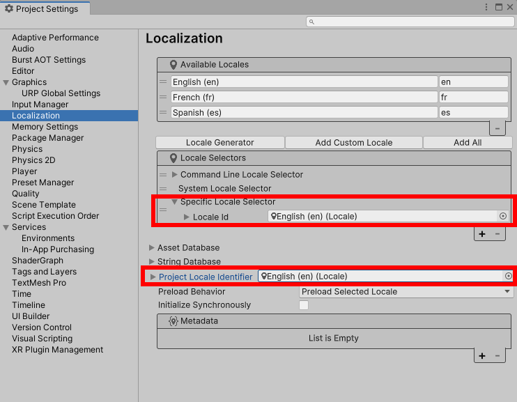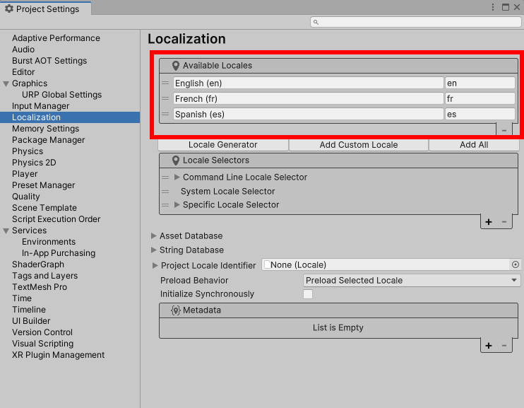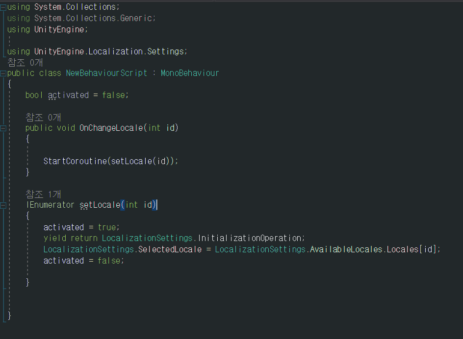 18)스트립트에서 locale 설정을 구현하려면 LocalizationSettings.SelectedLocale에 이용가능한 지역 및 언어 Locales를 할당합니다.