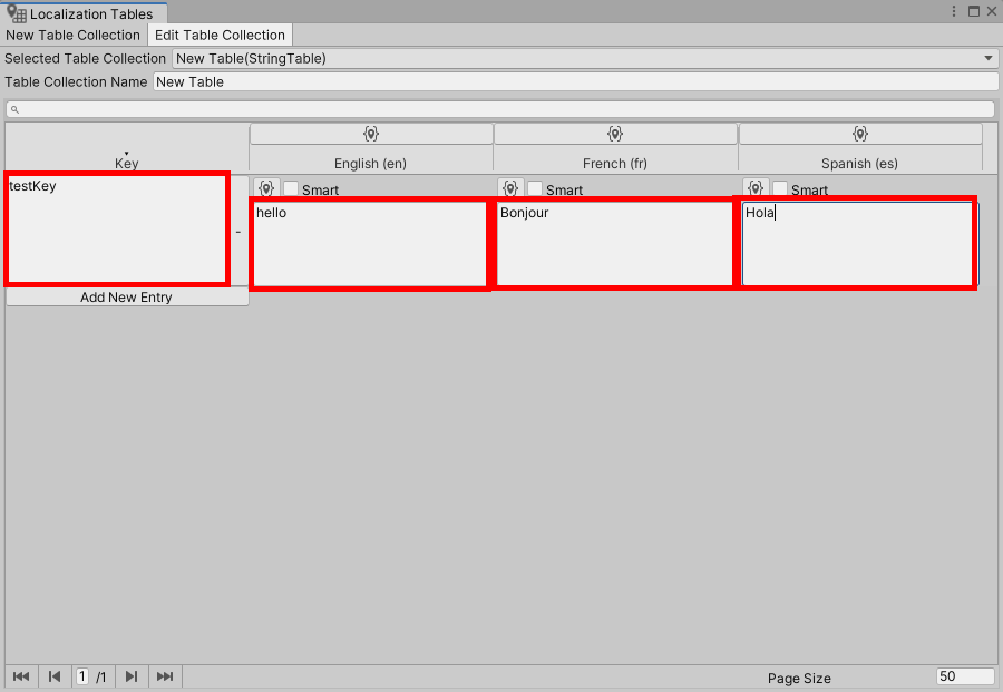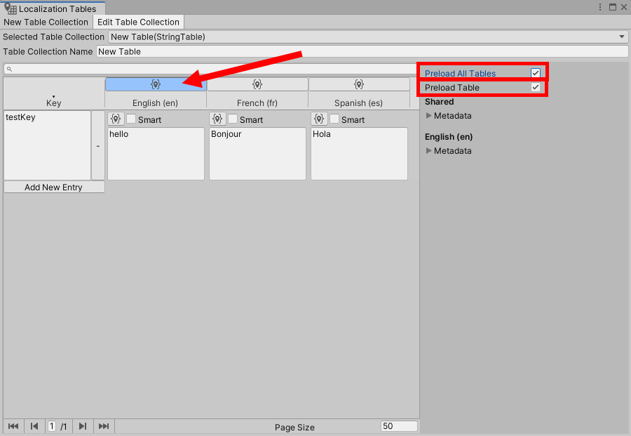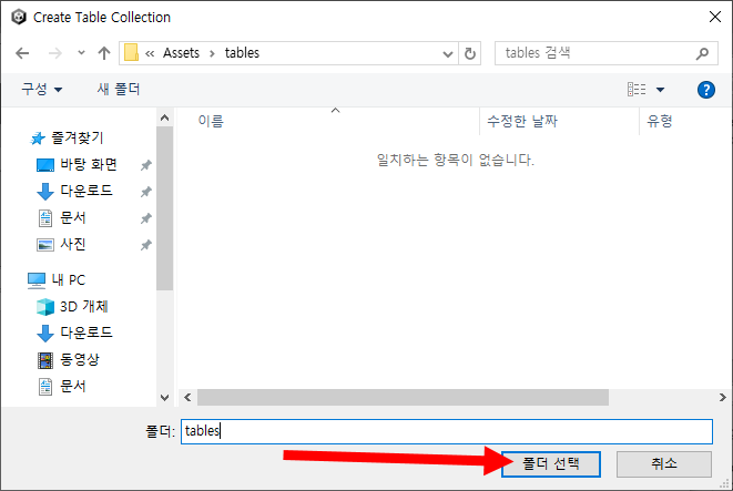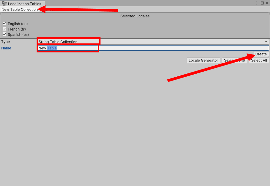사용할 locales에 체크하고 테이블 유형(예에서 문자열 테이블, String Table Collection)과 이름을 설정한후 create를 클릭하면 새로운 테이블을 생성합니다.