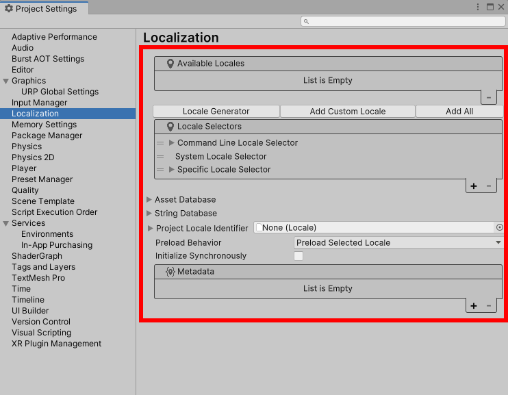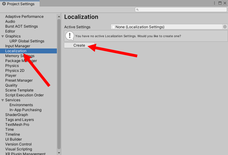 2)프로젝트 설정(project settings)에서 Localization 메뉴를 확인할수있습니다. Localization에서 create를 클릭하면 프로젝트에 새로운 Localization settings(지역화 설정) 에셋을 생성합니다.