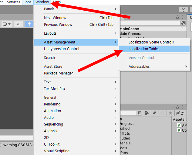 7)상단의 window 메뉴에서 asset management의 localization tables(지역화 테이블)로 이동합니다.
