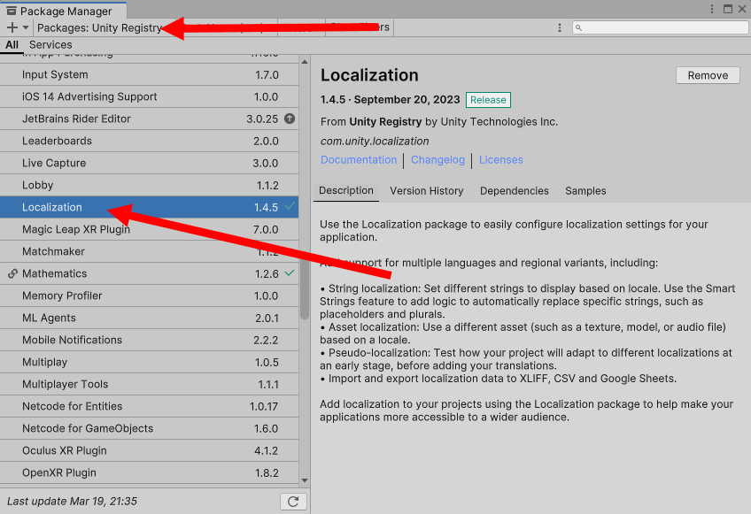 1)패키지 관리자(package manager)에서 Localization 패키지를 설치합니다.