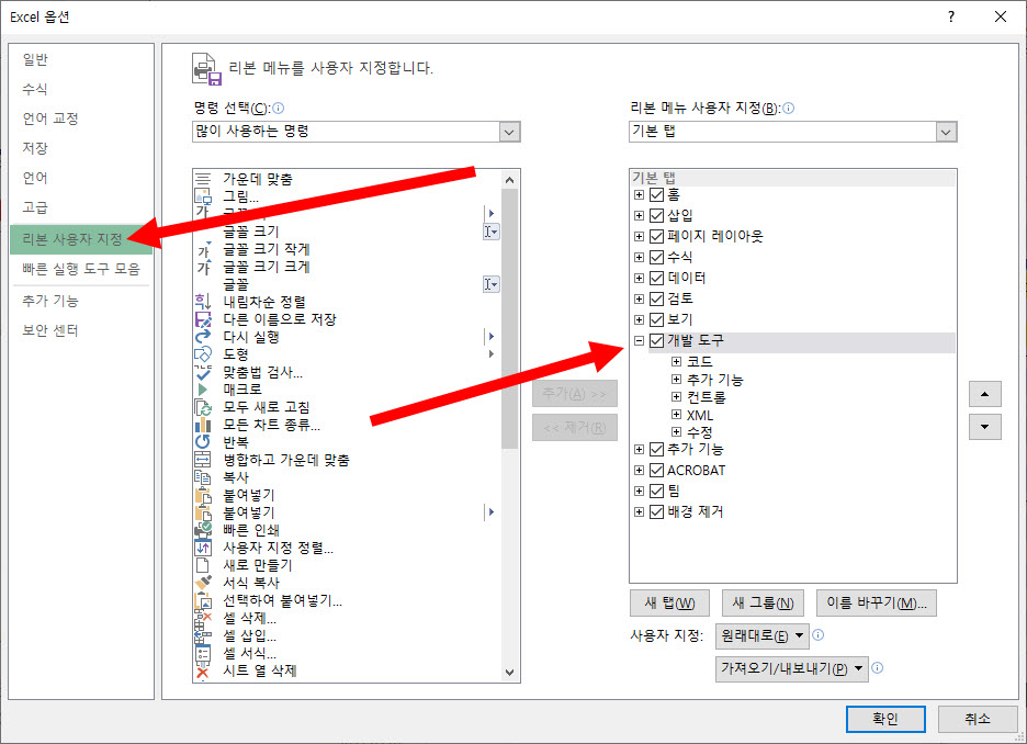 2)좌측 리본 사용자 지정 메뉴를 선택하고 리본 메뉴 사용자 지정의 개발도구에 체크하고 확인합니다.