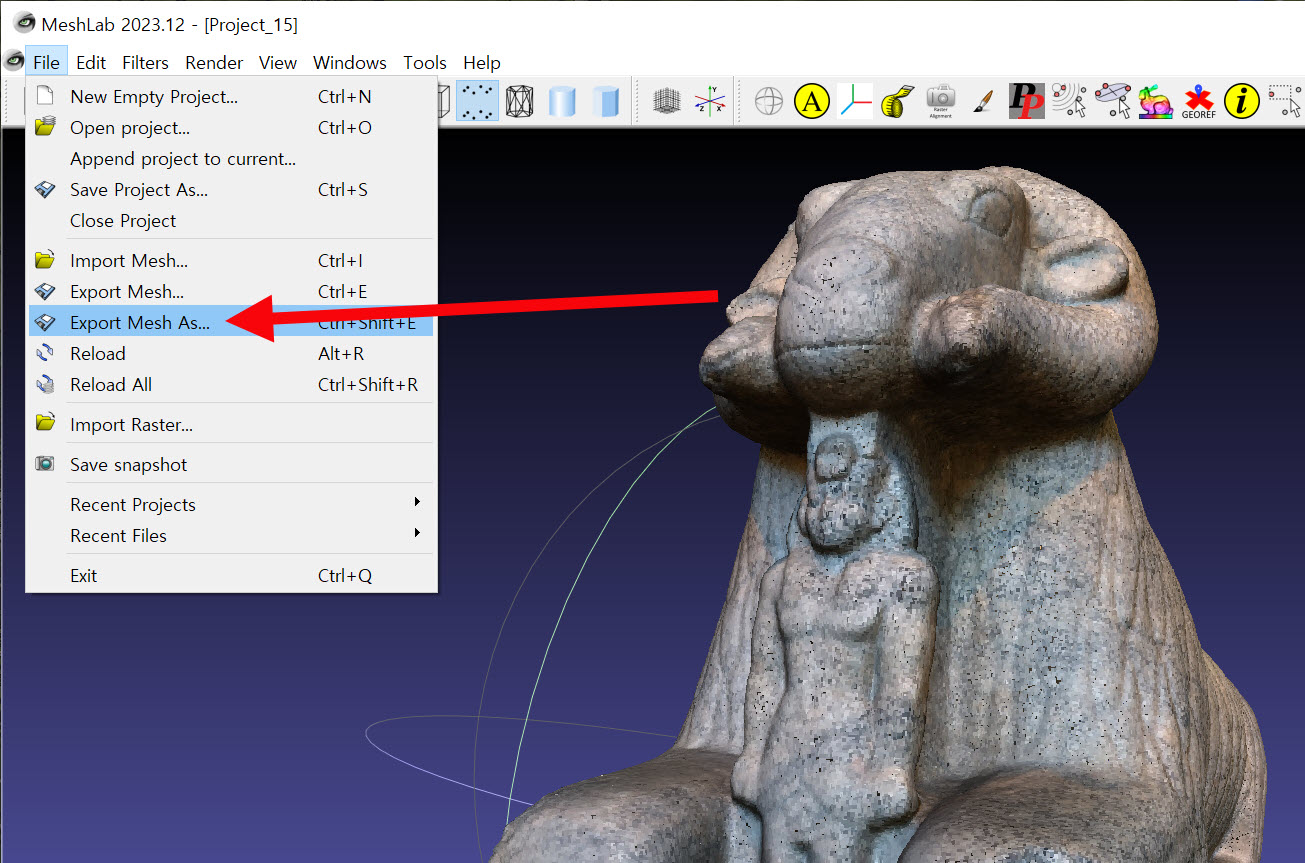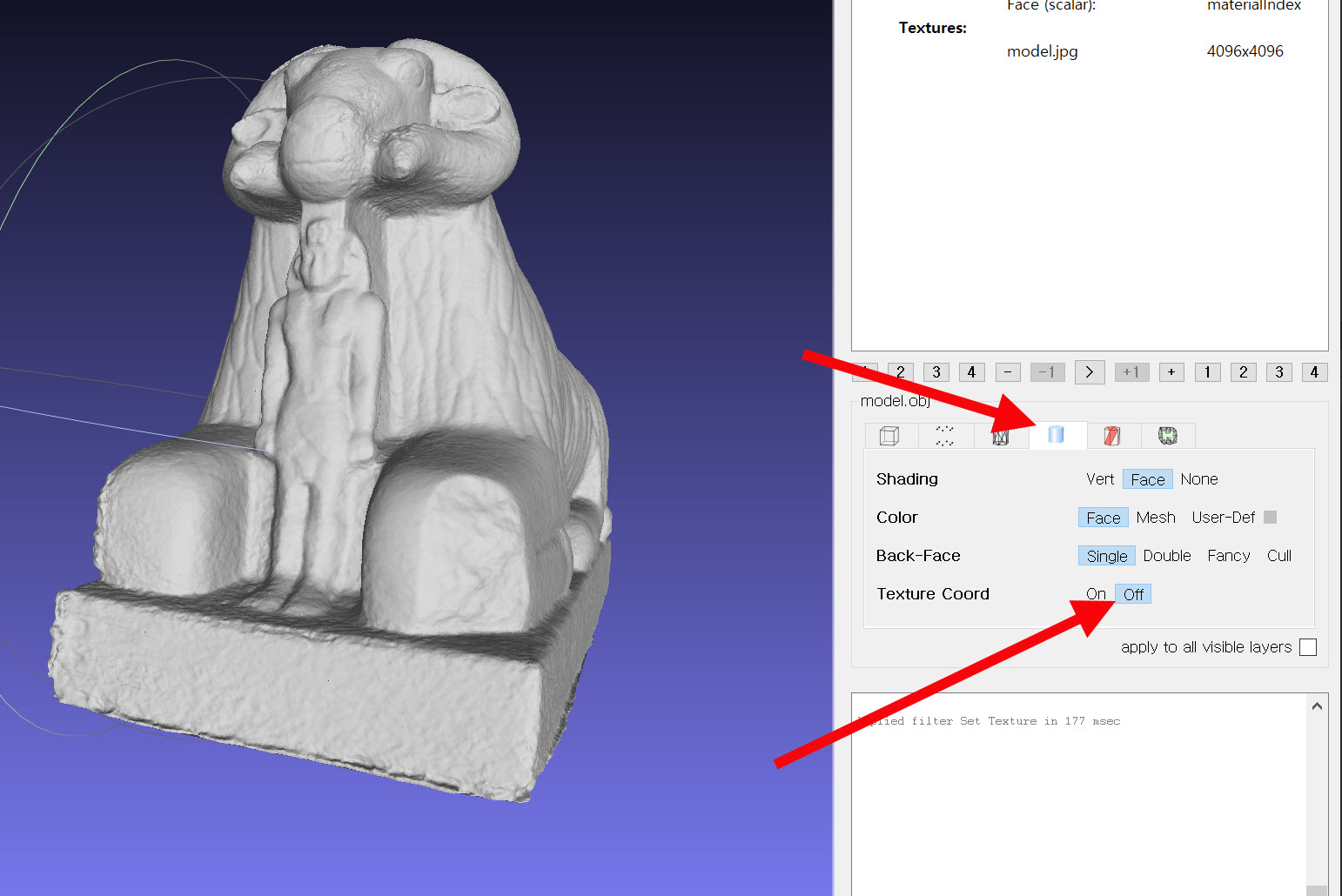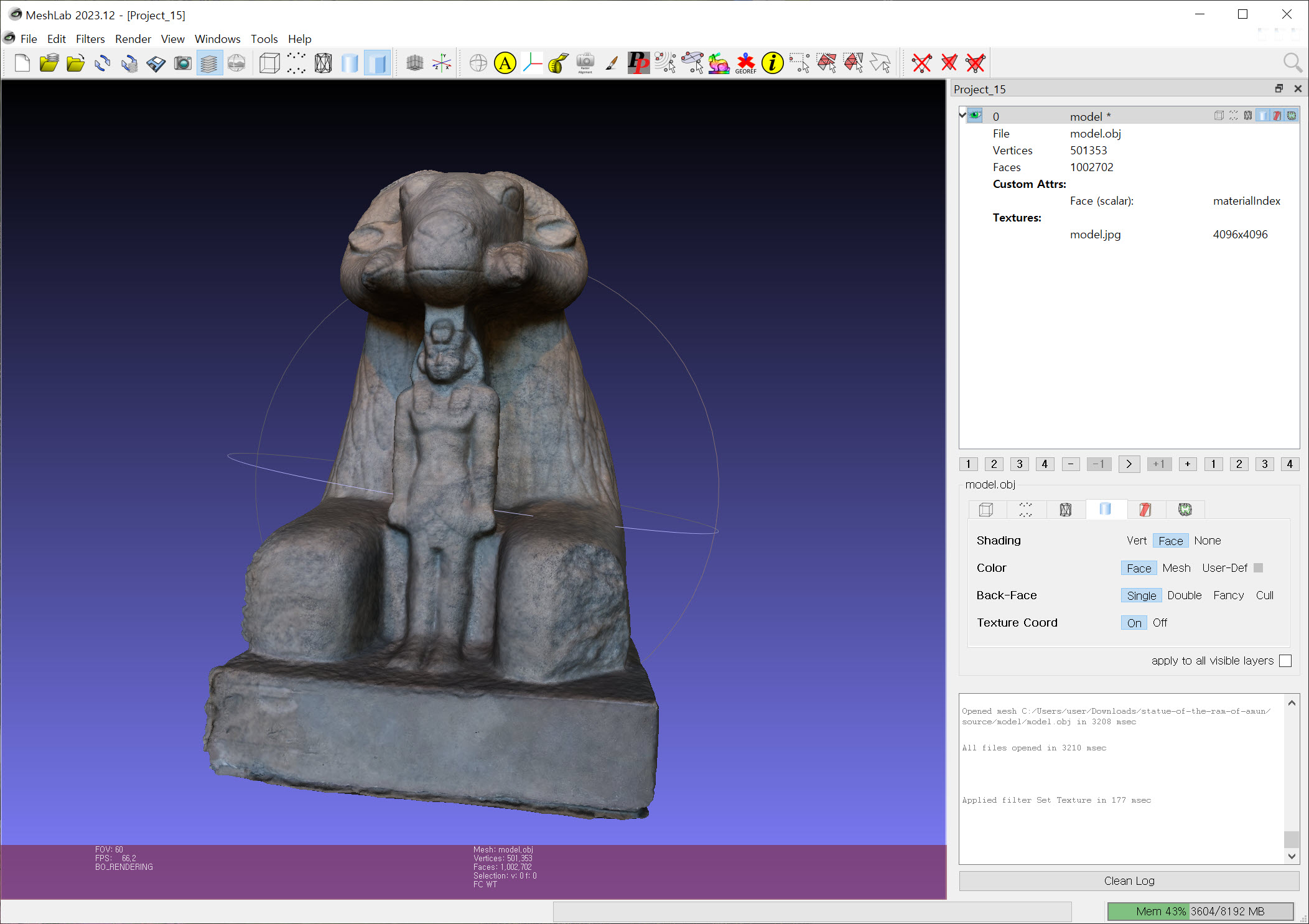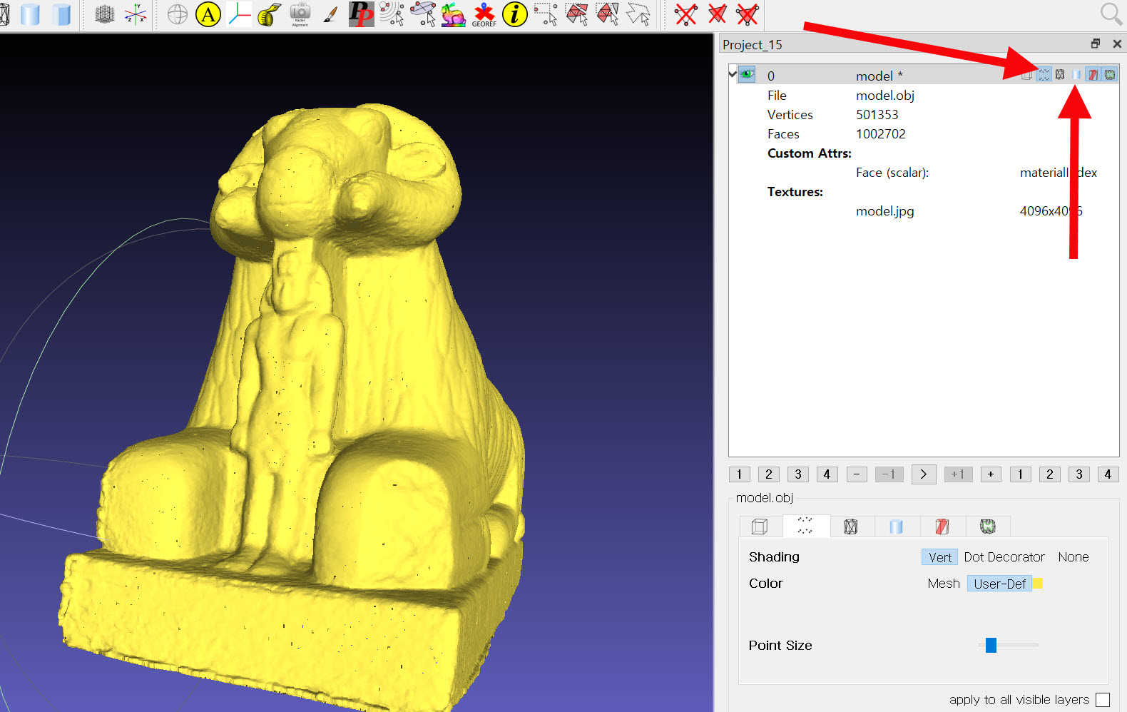 1)MeshLab에서 3D 오브젝트 및 텍스처를 가져오기합니다.