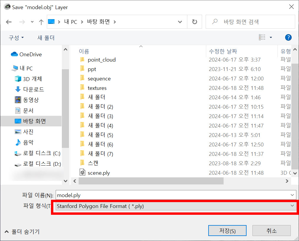 9)저장 경로를 설정하고 포인트 클라우드 파일 형식(.ply)을 선택하고 저장합니다.