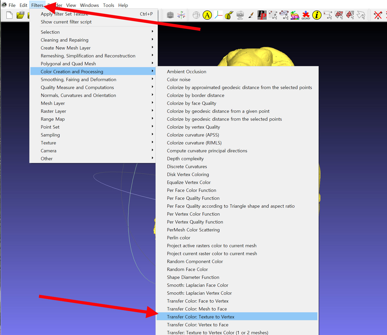 4)상단의 filters 메뉴에서 color creation and processing의 transfer color: texture to vertex를 선택합니다.