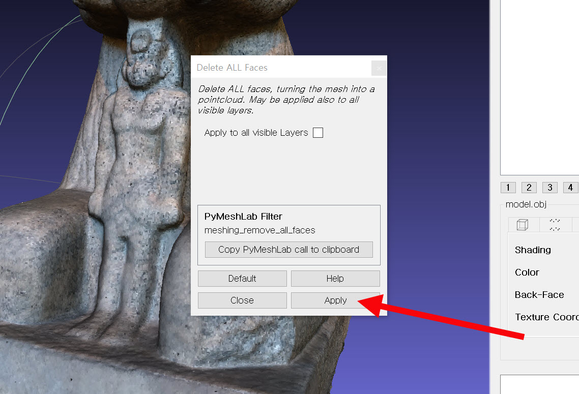 7)apply를 클릭하면 3D 오브젝트의 메시를 구성하는 모든 면(all faces)을 제거합니다.