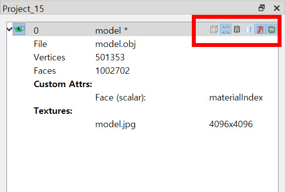 2)프로젝트의 레이어 목록 하단에서 3D오브젝트 메시의 텍스처 좌표를 비활성화합니다(texture coord, off)