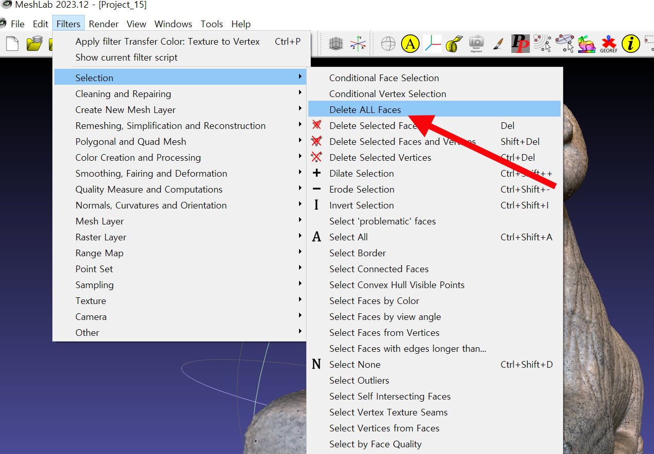 6)상단의 filters 메뉴에서 selection의 delete all faces를 선택합니다.