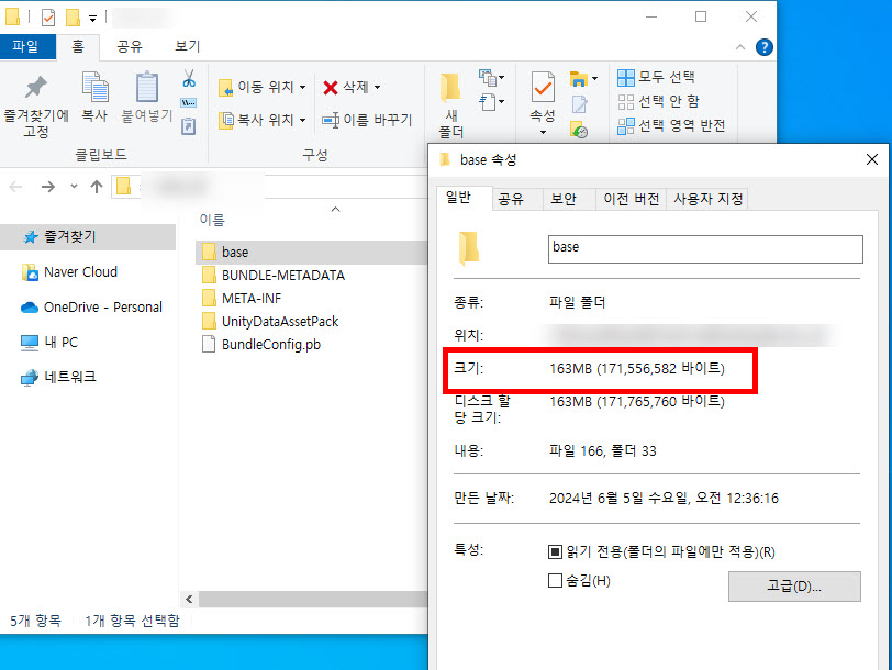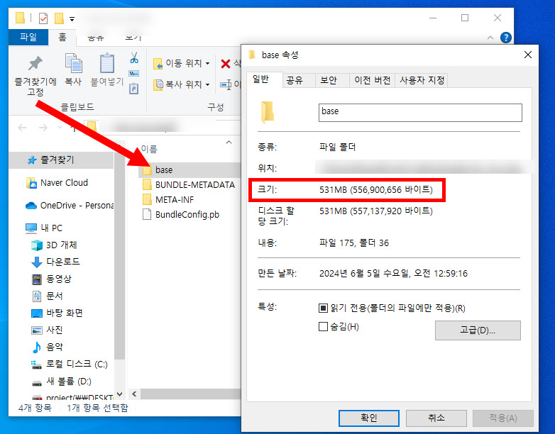 6)압축풀기한 폴더에서 base 폴더를 확인할수있습니다. 예에서 base 모듈의 크기가 200MB를 초과하는것을 확인할수있습니다.