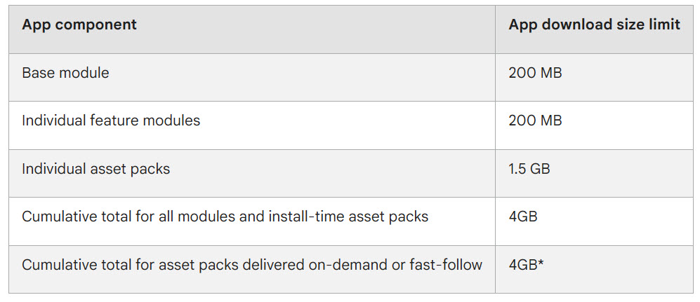 2)구글 플레이 콘솔에는 업로드 파일 크기의 제한이 있습니다. 특히 앱 구성요소인 기본 모듈(base module)의 크기가 200mb를 초과할수없습니다.(에셋 팩 데이터, individual asset packs의 크기는 1.5GB를 초과할수없습니다)